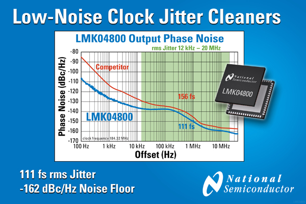 美国国家半导体公司(National Semiconductor Corp.)宣布推出一系列全新的时钟抖动滤除器,该系列产品拥有业界最低的相位噪声和均方根抖动性能:在12kHz与20MHz之间的均方根抖动只有111飞秒(fs);若输出频率为184MHz,锁相环的宽带噪声基底则只有-162dBc/Hz。对于无线和有线通信系统、测试和测量设备、医疗成像系统、软件无线电系统(SDR)和数字广播设备来说,低相位噪声除了可以提高系统的稳定性之外,也可降低整个物料清单(BOM)的成本。